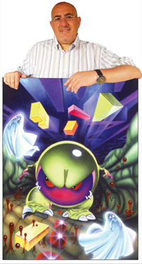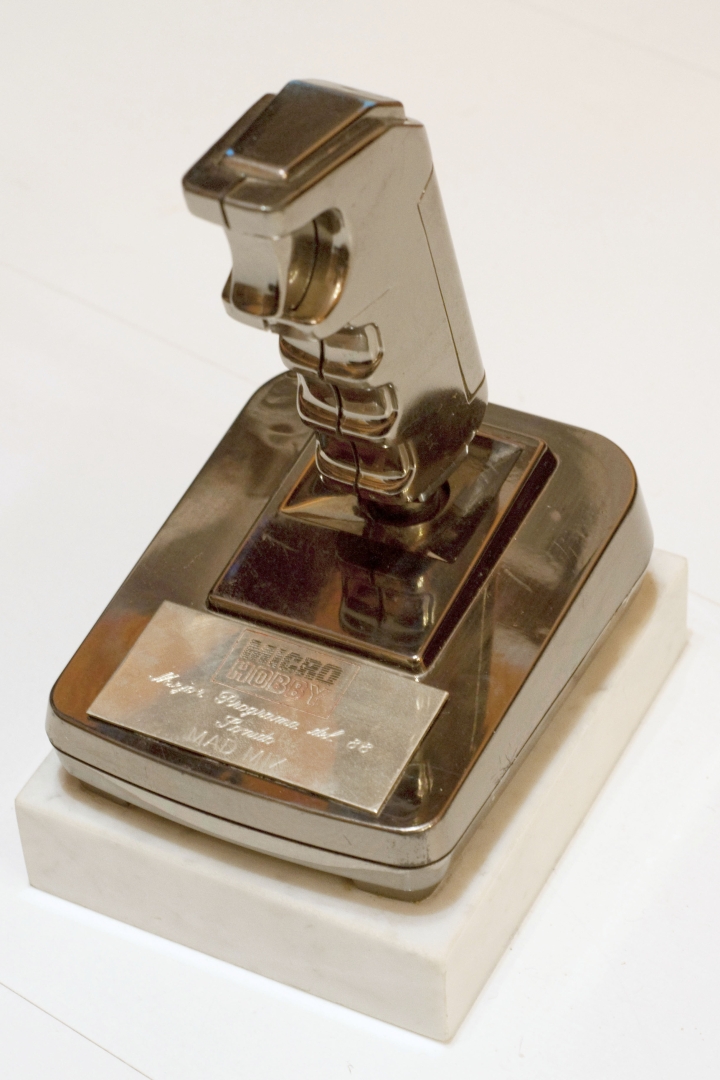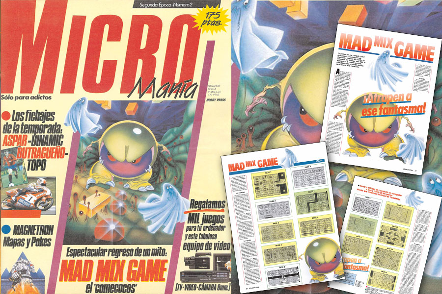 Rafa nos cuenta sus impresiones de los últimos días del desarrollo del juego: “Cuando ya teníamos casi ultimado el “master”, una grabación en bobina magnética de la que se duplicarían todas las copias, llegaron Paco y Alfonso Azpiri para plantear conjuntamente la campaña promocional. Azpiri portaba su enorme carpeta repleta de dibujos, de páginas cómics y de la ilustración de MadMix. Paco le había dicho que aunque en espíritu el juego era un comecocos, en realidad queríamos algo totalmente diferente, así que no teníamos la menor idea de lo que traería. Tras mantenernos un buen rato en vilo y hacerse de rogar, Azpiri descubrió su secreto, un comecocos con una boca enorme que llegaba hasta su entrecejo, con las patuchas del MOT y devorando bolitas por un intestino gigante, como si de un anuncio actual de yogures con bífidus se tratase. Tras unos eternos segundos sin decir ninguno nada, soltamos casi al unísono “¡Cojonuda!”, no creo que sea la mejor portada de Alfonso, pero desde luego creo que es la más llamativa sin necesidad de incluir a algunas de sus exuberantes presencias femeninas. Un juego adictivo con una magnífica e impactante portada parecía ser todo lo necesario para triunfar, pensaba yo reconociendo ahora mi ignorancia, pero Paco pronto me sacó de mi error. “Traedme todo lo tengáis del juego, vamos a diseñar la campaña que merece MadMix”, así que hicimos un despliegue completo de mis dibujos y diseños, y de todos los laberintos y gráficos de Roberto, lo que cubría por completo la mesa de reuniones. Y comenzó la actuación de Paco, como si estuviese en mitad de unos de sus conciertos, no me refiero a que se subiese a la mesa de reuniones a cantar, pero casi, no paraba de hablar de lo importante que era comunicar la idea de un comecocos revolucionario, de algo totalmente nuevo que haría historia y que cambiaría el concepto de los videojuego y… fue entonces cuando en uno de sus impulsivos movimientos volcó una taza de café poniendo perdidos todo y a todos. En ese momento, en medio del caos de todos intentando salvar los papeles, cogió su único folio que había estado garabateando en el escaso tiempo en que no había hablado y lo alzó chorreando aun café mientras decía con entusiasmo “esto es justo lo que necesitaba, ¡aquí tenemos la página de publicidad de MadMix!” y la plantó en mitad del caos de la mesa “¡Enviadla a todas las revistas!”. Y así comenzó a publicitarse el juego un par de meses antes de su publicación, una página de publicidad llena de manchas de café con sus apuntes. Ni que decir tiene que semejante puesta en escena generó una gran intriga en los medios, que comenzaron inmediatamente a reclamar el juego para verlo. Durante la locura del cierre del master era habitual dormir pocas horas, con la fecha de entrega pisándonos los talones todo parecía ponerse en nuestra contra, aún estábamos creando laberintos, ajustando la jugabilidad, y evitando que los personajes tomaran vida propia e hicieran cosas absurdas como saltarse los muros del laberinto, incluso nuestro personaje hacía algunos ascos a algunos cocos cuando le apetecía, pero la locura final llegó cuando nos dijeron teníamos que dejar todo, los ingleses estaban encantados con el juego, tanto que lo publicarían conjuntamente con Pepsi, pero que ¡había que rehacer el juego! Pepsi quería introducirse en el mercado de los videojuegos y le encantaba MadMix más que cualquier otro juego pero tenían miedo de toparse con problemas con Namco, así que querían que cambiásemos a Mad, la forma de juego, colocar su logo y hasta los laberintos, vamos que querían otro juego a medida y todo ello en una semana. Aceptamos el Challenge de Pepsi y en un par de días les preparamos hasta tres versiones, una de ellas muy simpática un mono que se comía los cocos, pero al final se decidieron por un Mad con patuchas que iba aplastando los cocos en lugar de comérselos. El juego se publicó en Europa con un éxito arrollador que desbordó todas nuestras expectativas. Hoy en día puedo decir que es el juego con el que mejor me lo he pasado jugando, pero sobre todo haciéndolo. Estoy muy orgulloso de MadMix en su 25 aniversario”.Una música con premio