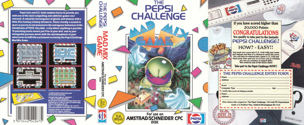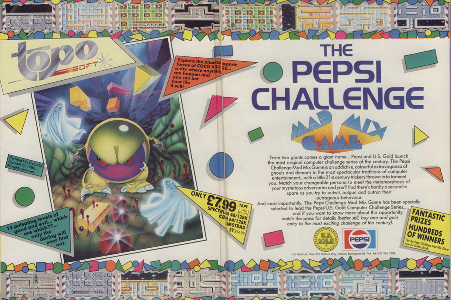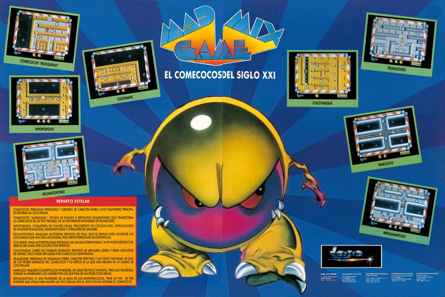 Recuerda Rafa que “Al mes de comenzar a trabajar en el código ya teníamos a un envalentonado Mad que recorría un pequeño laberinto engullendo cocos y a unos acobardados enemigos que apenas si se atrevían a toserle. Fue entonces cuando sin previo aviso descubrí la corbata estampada más horrorosa que jamás haya visto en mi vida colgando del espigado cuello de un guiri barbilampiño trajeado en verde que acompañaba a Paco Pastor. Paco, como buen español superaba la notable desventaja de altura con su gracia y desparpajo de la que carecía tan notable guiri, del que luego supimos que se trataba de algún alto gerifalte de US GOLD. Venía a ver la aventura de Topo, Paco le fue presentando uno a uno cada proyecto, claro que en tan escaso tiempo de desarrollo poco podíamos enseñarle, pero por suerte yo ya tenía Mad danzando y haciendo sus cosas, nada más verlo su impertérrita expresión cambió levemente a sorpresa. Paco no paraba de hablarle en un inglés que casi entendíamos lo que me daba a entender que el guiri no se estaba enterando de nada, pero el entusiasmo de Paco, y sobre todo sus gestos y una buena dosis de mímica acabaron por contagiar de entusiasmo al guirí que acabó esbozando una leve sonrisilla. Su sonrisilla culminó en carcajada cuando vio como un cabroncete primo lejano de Mad comenzaba casi por propia iniciativa propia a espachurrar los cocos embutiéndolos en el suelo, enseguida acompañé a la carcajada del resto porque yo no recordaba haber programado eso. Paco me dijo luego que el guiri se había marchado para su pueblo encantado con MadMix Game, y que tenía grandes planes para él. Así nació MadMix Game The PEPSI Challenge, que en la caja de su versión inglesa luciría finalmente un estampado sospechosamente parecido a la famosa corbata del guiri.”Una portada de Alfonso Azpiri diferente