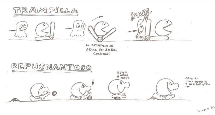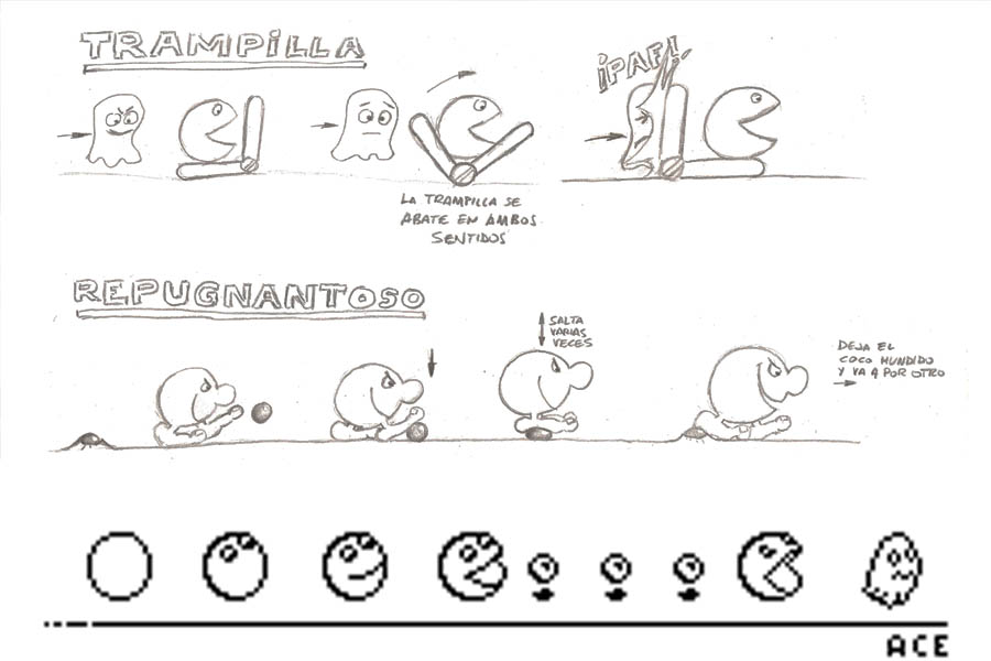 Rafa nos sigue contando el día a día del desarrollo del juego: “Los siguientes días fueron frenéticos, aproveché que tardaban en llegar los flamantes ATARI ST con disquetera que usaríamos para programar, y desarrollé todo el proyecto del comecocos que llamé inicialmente MaxMixGame (por lo de los recopilatorios veraniegos de los 80). En unos diez folios plasmé por escrito un montón ideas detalles y bocetos con enemigos, situaciones del juego y algunos laberintos. Javier se los llevó a Paco y a su regreso me dijo que a Paco le había encantado, pero que no entendía casi nada porque además estar escrito en “Cordobé” era una “mezcla de locos”… así nació MadMix Game. A Paco Pastor lo conocí en persona cuando le presenté mi primer juego en 1986, se trataba de un juego de naves aunque más bien podía considerarse como un Arkanoid, le encantó, y sin más me lo compró para no publicarlo… cosas de Paco… sabía que necesitaba un empujocillo económico para acabar el SURVIVOR y ampliar mi necesitado Spectrum de 16K a los 48K del resto de sus congéneres. En otra ocasión coincidiendo con mi cumpleaños me visitó en Córdoba, mi madre casi se cayó de espaldas al ver entrar por la puerta al famoso cantante de Fórmula V, él casi se cayó de espaldas porque era casi Julio y venía trajeado ¡en Córdoba! En el encuentro Paco me presentó el embrión de Topo, y como tenía la habilidad para contagiar su entusiasmo me lo pegó enseguida y decidimos que SURVIVOR fuese el primer juego de Topo. La gente se arremolinaba a su salida a las puertas de mi casa para ver al famoso cantante, aunque los ignorantes de la canción del verano se arremolinaba solo para ver a uno trajeao en Córdoba en Julio. Una vez que llegaron los esperadísimos Ataris, y salí de mi asombro al descubrir las posibilidades de guardar mi código en disquetes de 720Kb con su casi ilimitada capacidad, me puse manos al programa, con la decisión de llenar todo un disquete con mi código. No podía reutilizar nada del código de SURVIVOR, porque en este primaba el poder crear enormes decorados diferentes llenos de colorido y que consumieran poca memoria, mientras que en MadMix tenía que primar la velocidad, y un scroll muy suave y rápido.| Spoiler para los interesados en la programación artesanal: Por entonces, si querías que tu juego se moviese dentro de los frames correspondientes a un mismo día, tenías que programar en ensamblador, esto es, instrucciones directas al pequeño microprocesador Z80. Para ello me empeñé en desarrollar una rutina capaz de realizar los volcados de pantalla a una velocidad de vértigo… me explico... en los pequeños ordenadores de 8bits no podíamos darnos el lujo de pintar los escenarios y los personajes directamente en pantalla porque se vería un parpadeo continuo muy molesto, además de ver a nuestro pequeño Mad en paños menores, así que lo que hacíamos era pintar todo el decorado en un buffer (vamos, en un rinconcito oscuro de la memoria interna) y luego pegábamos los muñecos encima, primero borrando el hueco en el decorado donde aparecería el personaje, y luego pintándolo. Una vez que tenía lo que quería mostrar en pantalla había que volcarlo rápidamente, para ello se usaba una instrucción muy potente llamada LDIR, pero no era lo suficientemente rápida… pero había un par de instrucciones más rápidas aún que movían datos en bloques de 16bits (como si de un micro de ultimísima generación de 16bits se tratase) y además consumiendo muy pocos ciclos de proceso… se trataba de las instrucciones PUSH y POP. Estas instrucciones manejaban la pila de datos del micro, claro que cualquier programador sabe que es muy peligroso jugar con ella porque suele acabar en inesperados e interesantísimos cuelgues alucinantes. Me las apañé para convencer al pequeño Z80 de que no se molestase si le tocaba las pilas, así que lo que hacía era “POPear” una línea completa del buffer de pantalla y luego “PUSHearla” en la mismísima pantalla real. De este modo conseguía hacer el volcado completo en una tercera parte de un frame, que a su vez sincronizándolo con el barrido evitaba cualquier parpadeo. El inconveniente es que en el buffer de pantalla tenía que mezclar cada línea de pantalla con cuatro bites que reapuntaban la pila a la extraña disposición de las pantallas del Spectrum y del MSX. Esta es la razón por la que había que dejar un marco alrededor de la pantalla, y que Roberto aprovechó para rellenar de caramelos... (Fin del Spoiler) |
